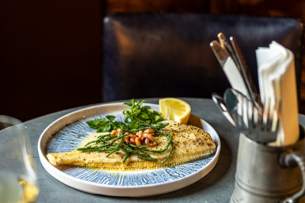 Whole grilled Cornish sole, brown shrimp, samphire, crushed new potatoes | 28.5 599 kcals